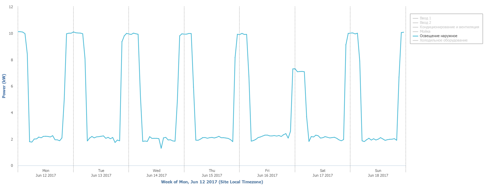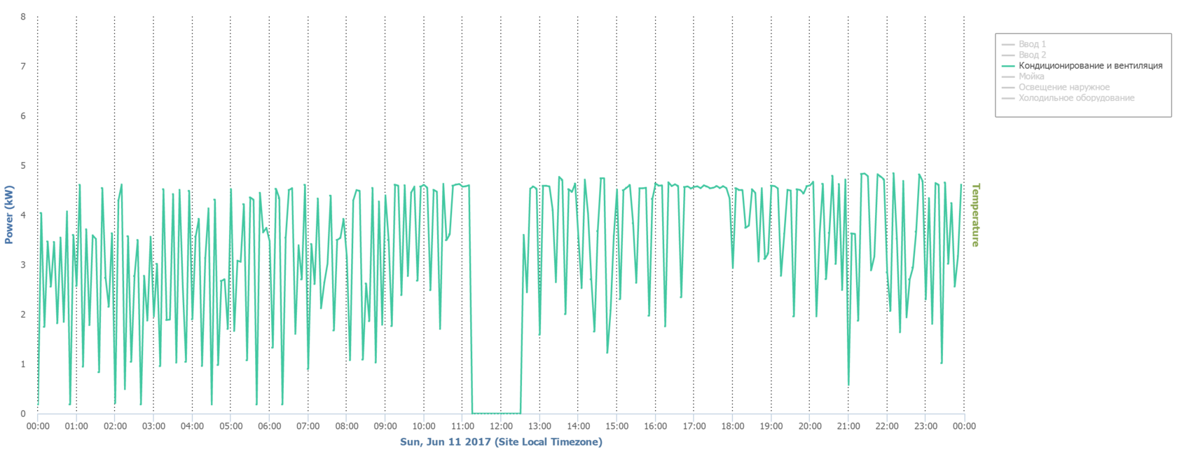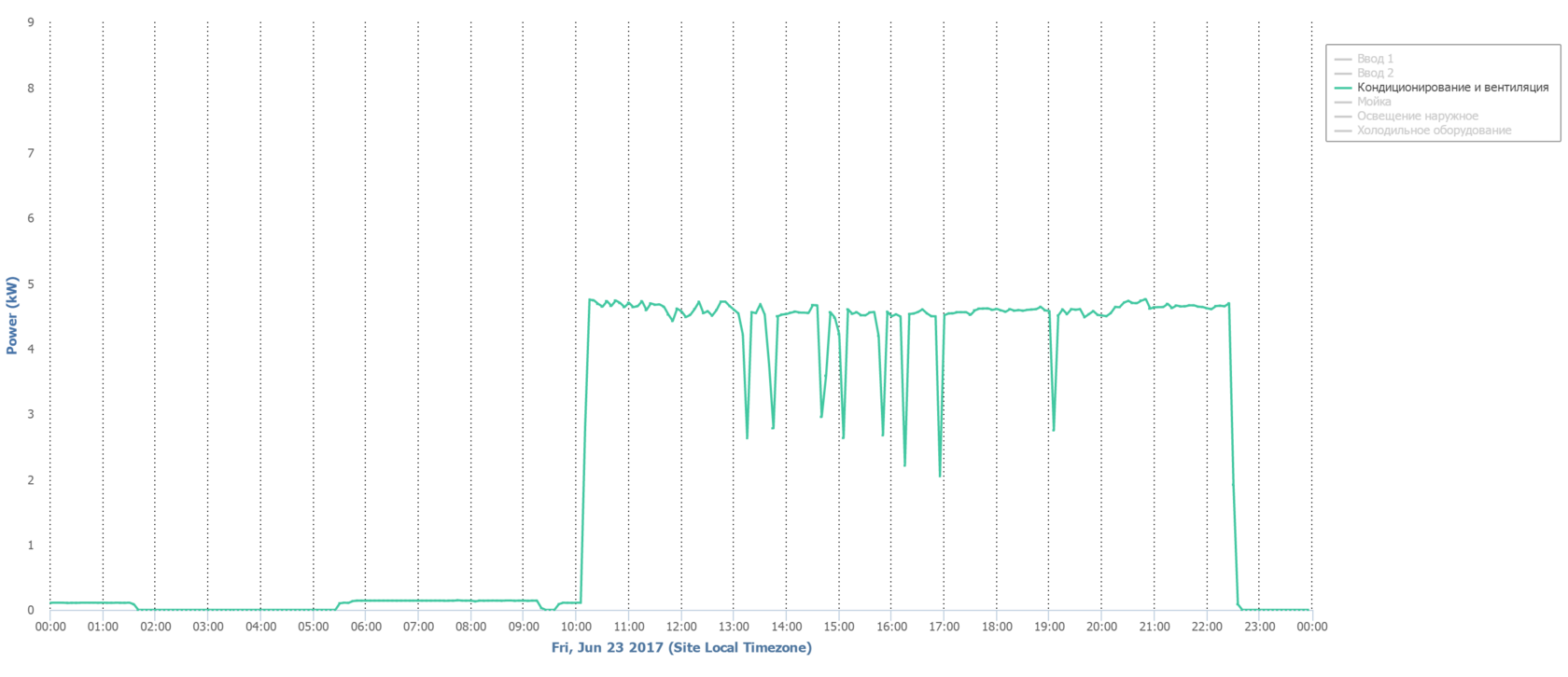Проведенная настройка вентиляции, установка четких режимов вкл./выкл., позволила значительно сократить энергопотребление. На графике указанном ниже четко прослеживается утренний режим включения и вечернее отключение.